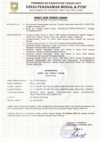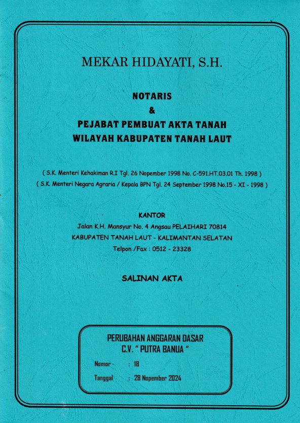 CV. PUTRA BANUA ( PB ) merupakan perusahaan swasta berskala nasional yang memiliki pengalaman dibidang pelayanan, jasa dan perdagangan. CV.PUTRA BANUA saat ini beroperasi di Kalimantan Selatan. Perusahaan didirikan pada tanggal 16 November 2011 berdasarkan Isian Akta Notaris I yang dibuat oleh Mekar Hidayat, SH , serta telah melalui persetujuan dari Menteri Kehakiman dan Hak Asasi Manusia Republik Indonesia surat keputusan Nomor : C-591.HT.03 .01 Th.1998 pada tanggal pada tanggal 16 November 2011. Berdasarkan keputusan tersebut, perusahaan di tetapkan Perseroan Komanditer.